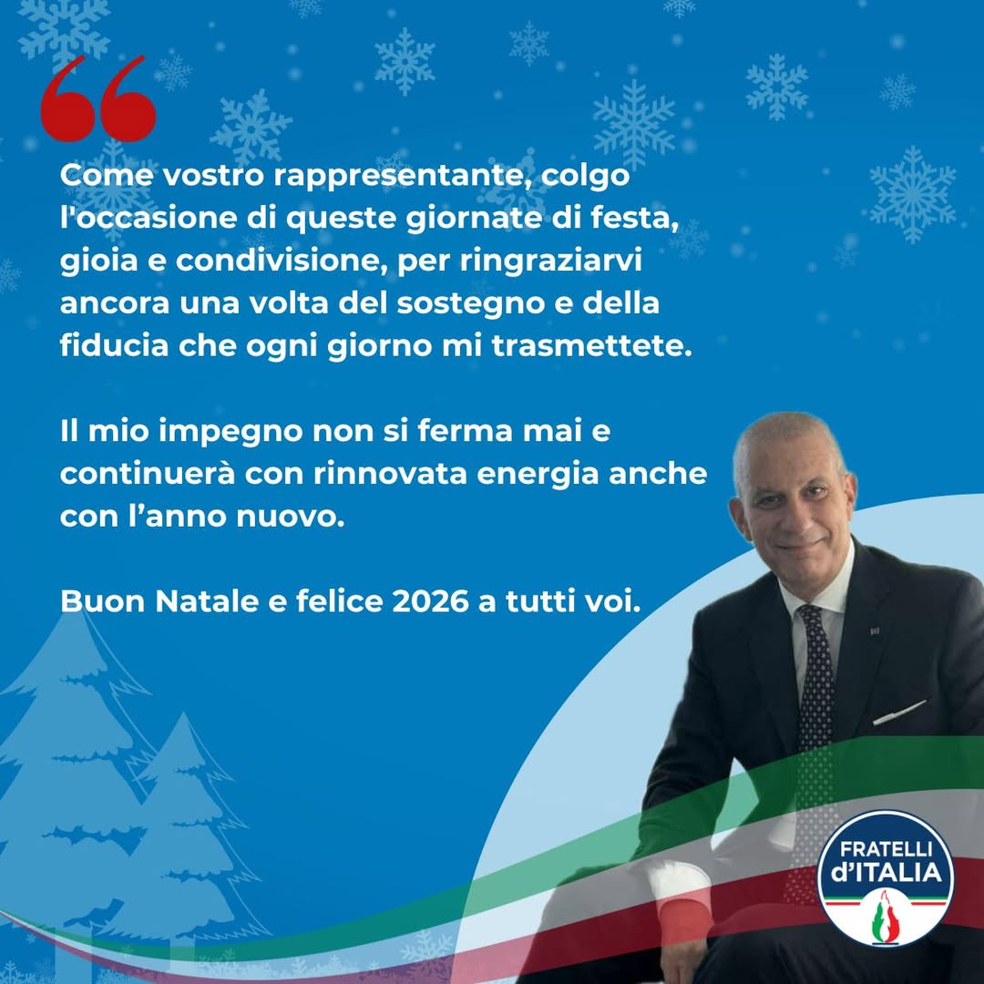 Come vostro rappresentante, colgo l’occasione di queste giornate per ringraziarvi ancora una volta del sostegno e della fiducia. Il mio impegno non si ferma mai e continuerà con rinnovata energia nel 2026.