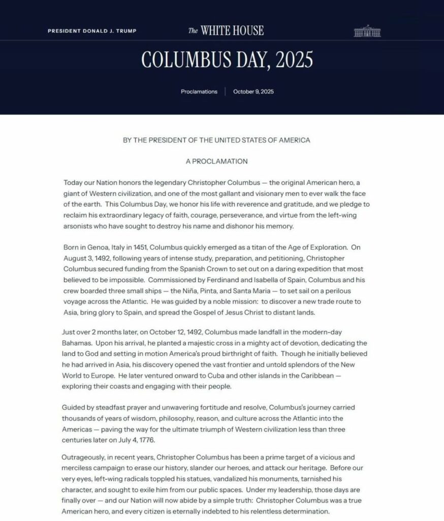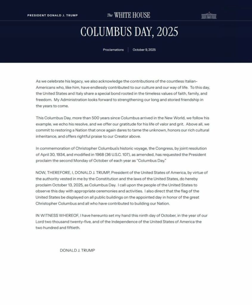 Desidero ringraziare il Presidente Donald J. Trump per la Proclamazione del Columbus Day 2025, che ridà giustizia e dignità a una ricorrenza che una certa parte politica, accecata dall’ideologia, aveva cercato di cancellare in nome del revisionismo e della “cancel culture”.